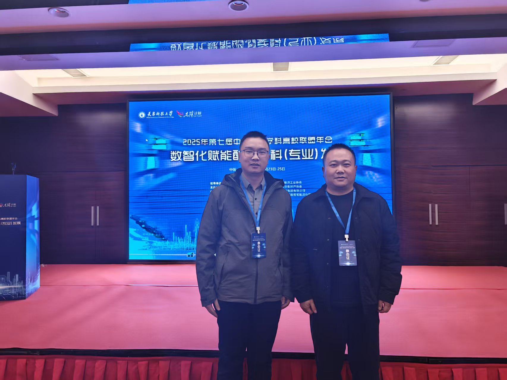 本网讯(李运通)2025年10月23日至25日,以“数智化赋能酿酒学科(专业)发展”为主题的第七届中国酿酒学科高校联盟年会在天津隆重召开。本次会议由中国酿酒学科高校联盟主办、天津科技大学承办,汇聚了全国酿酒学科的顶尖专家学者。恰逢国家工业和信息化部正式将酿酒产业列为“历史经典产业”的背景下,本次年会具有承前启后的深远意义。千亿球友会酿酒工程专业教师余佶、李运通应邀参会,余佶老师在大会上作了发言,向全国同行展示了千亿球友会的办学特色和显著成果。